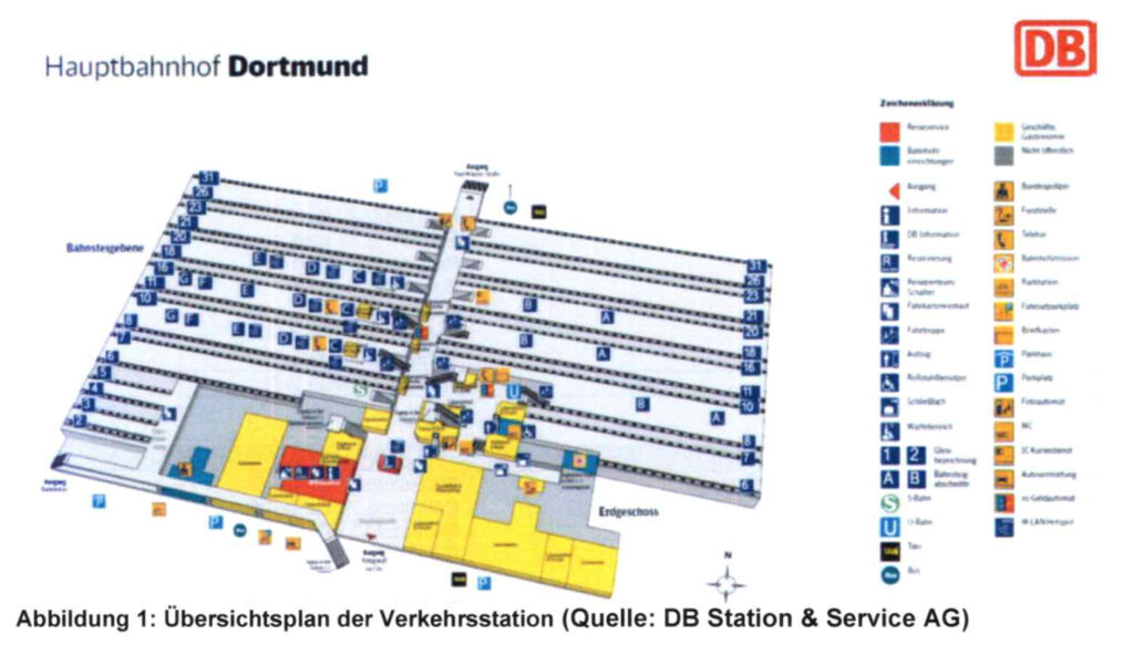 - Erdgeschoss (EG): Vermarktungsflächen, Reisezentrum, Bundespolizei, Gaststätten, Bahnsteige